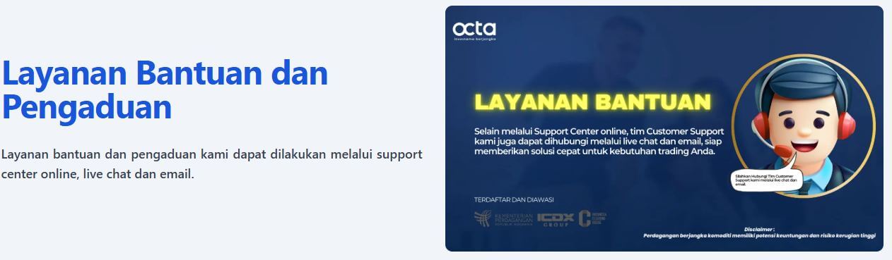 Dukungan Pelanggan: Octa menyediakan beberapa kanal support yang memudahkan nasabah berkomunikasi. Pertama, ada fitur Live Chat di situs resmi mereka. Tinggal klik tombol chat, Anda bisa terhubung dengan CS representative dalam waktu singkat (biasanya antrian tidak lama). Live chat ini paling praktis untuk tanya jawab cepat, misal tanya promo, kendala login, dsb. Kedua, ada support via WhatsApp di nomor +62 811-1050-0202. Ini jarang-jarang, broker sediakan WA resmi – tandanya mereka mengikuti tren komunikasi sekarang. Dengan WA, nasabah bisa chat langsung, bahkan kirim screenshot jika ada masalah teknis, sehingga komunikasinya enak. Ketiga, ada dukungan melalui telepon di nomor (021) 3104070. Buat yang butuh penjelasan detail atau enggan mengetik, tinggal telepon ke kantor mereka di jam kerja. Biasanya disambut staff CS yang ramah. Keempat, tentu ada email support ([email protected]). Ini berguna untuk keperluan yang membutuhkan penjelasan panjang atau lampiran dokumen, misal komplen resmi, verifikasi manual, dsb.